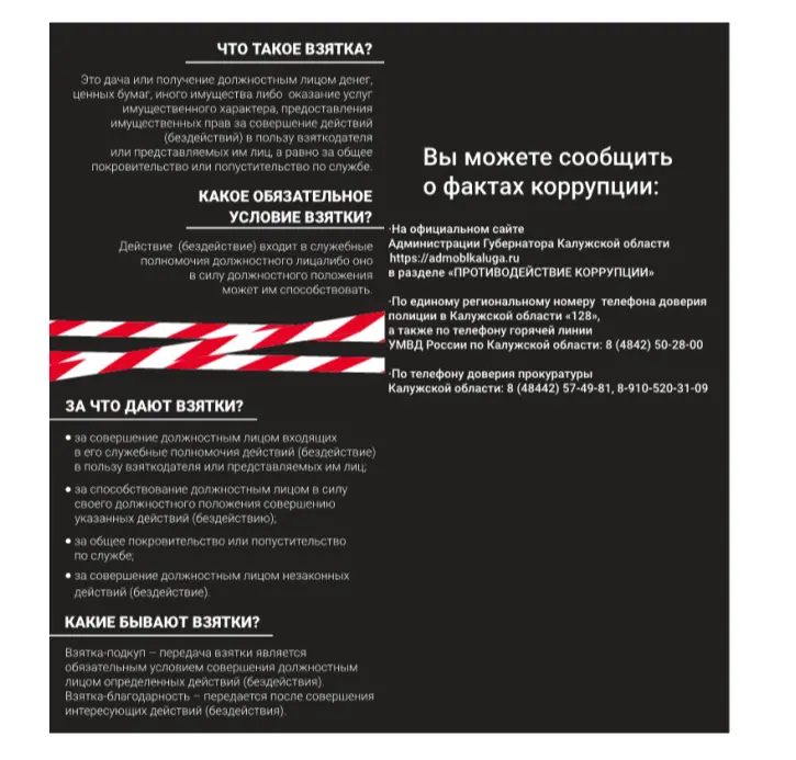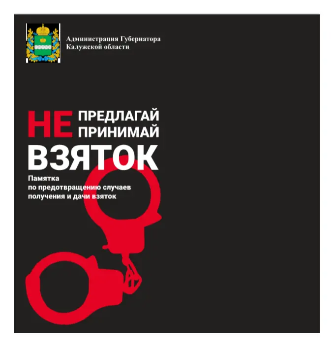 Памятка по предотвращению случаев получения и дачи взятки, разработанная Администрацией Губернатора Калужской области.